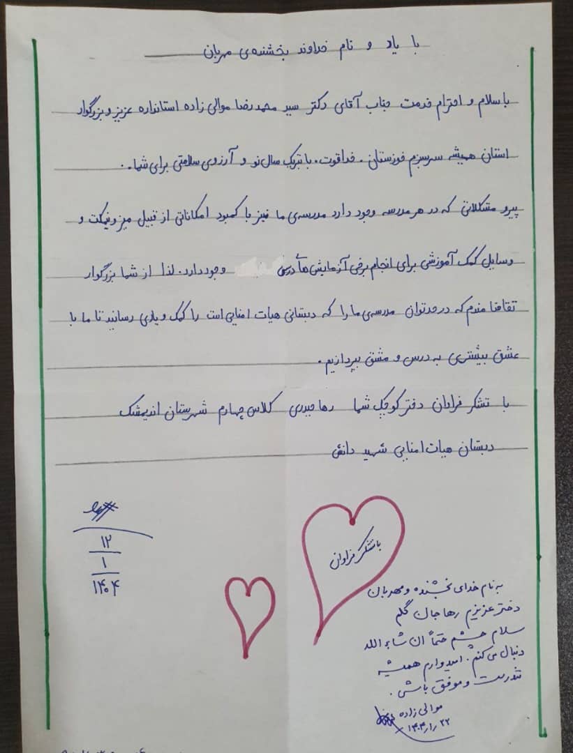 این کودک که در یکی از مدارس شهرستان اندیمشک تحصیل میکند، در نامهای به استاندار از مشکلات مدرسهاش از جمله کمبود نیمکت و نبود وسایل کمکآموزشی گلایه کرده بود.